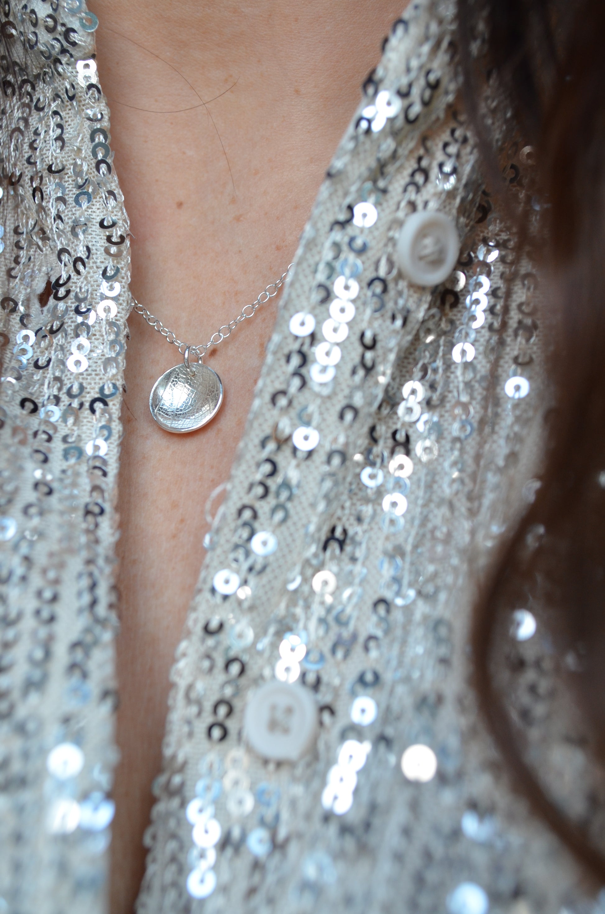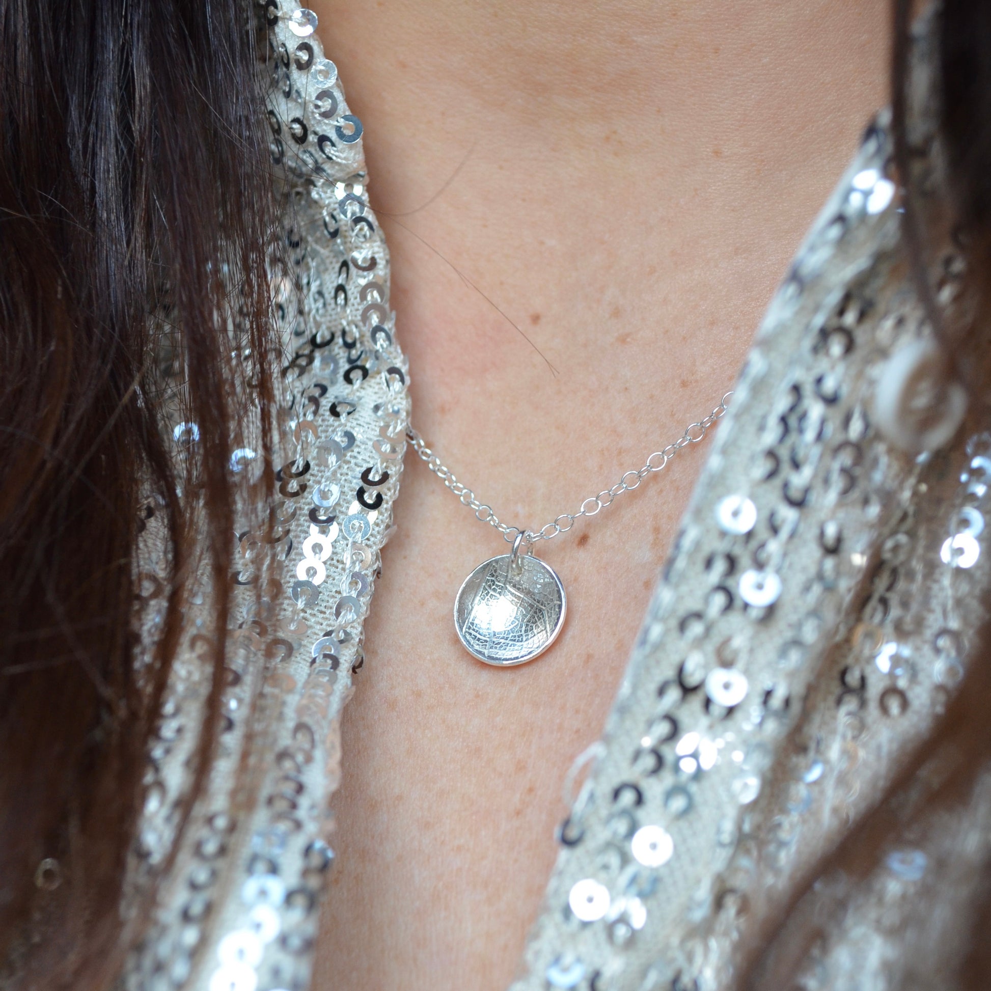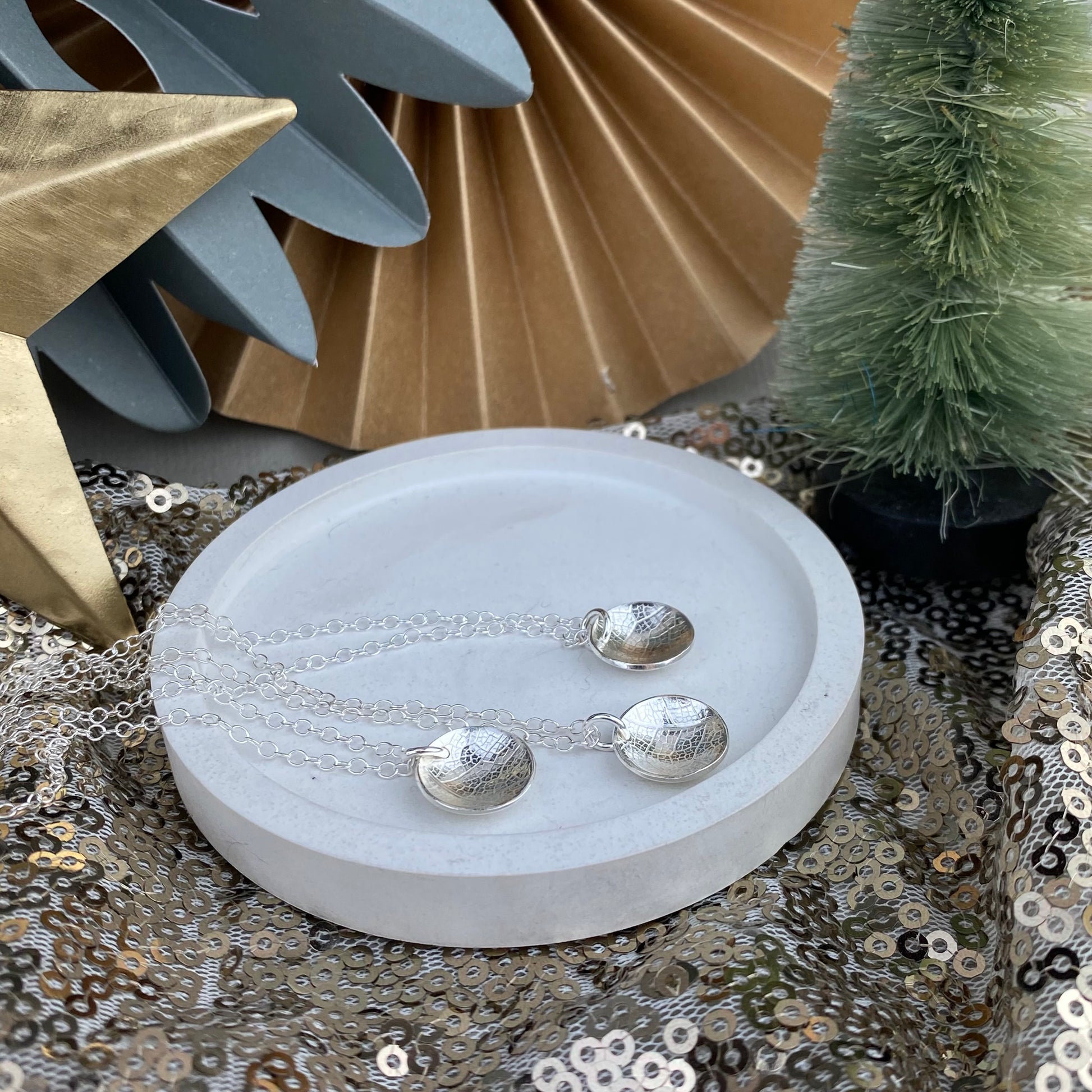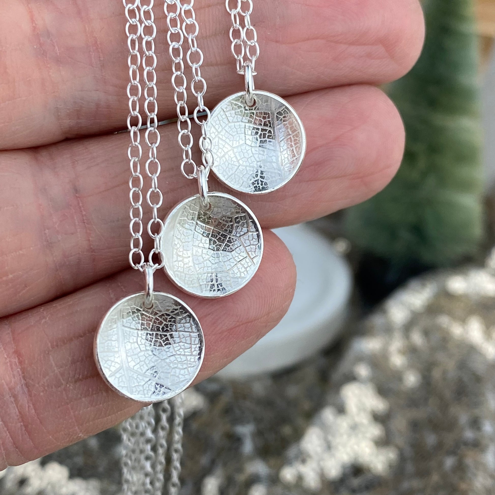 Formed by rolling skeleton leaves directly onto sterling silver to make a permanent leaf impression, these pendants are then delicately domed for a classic everyday look. Hung on an 18" sterling silver trace chain. Due to the nature of the rolling each of the prints will be unique.