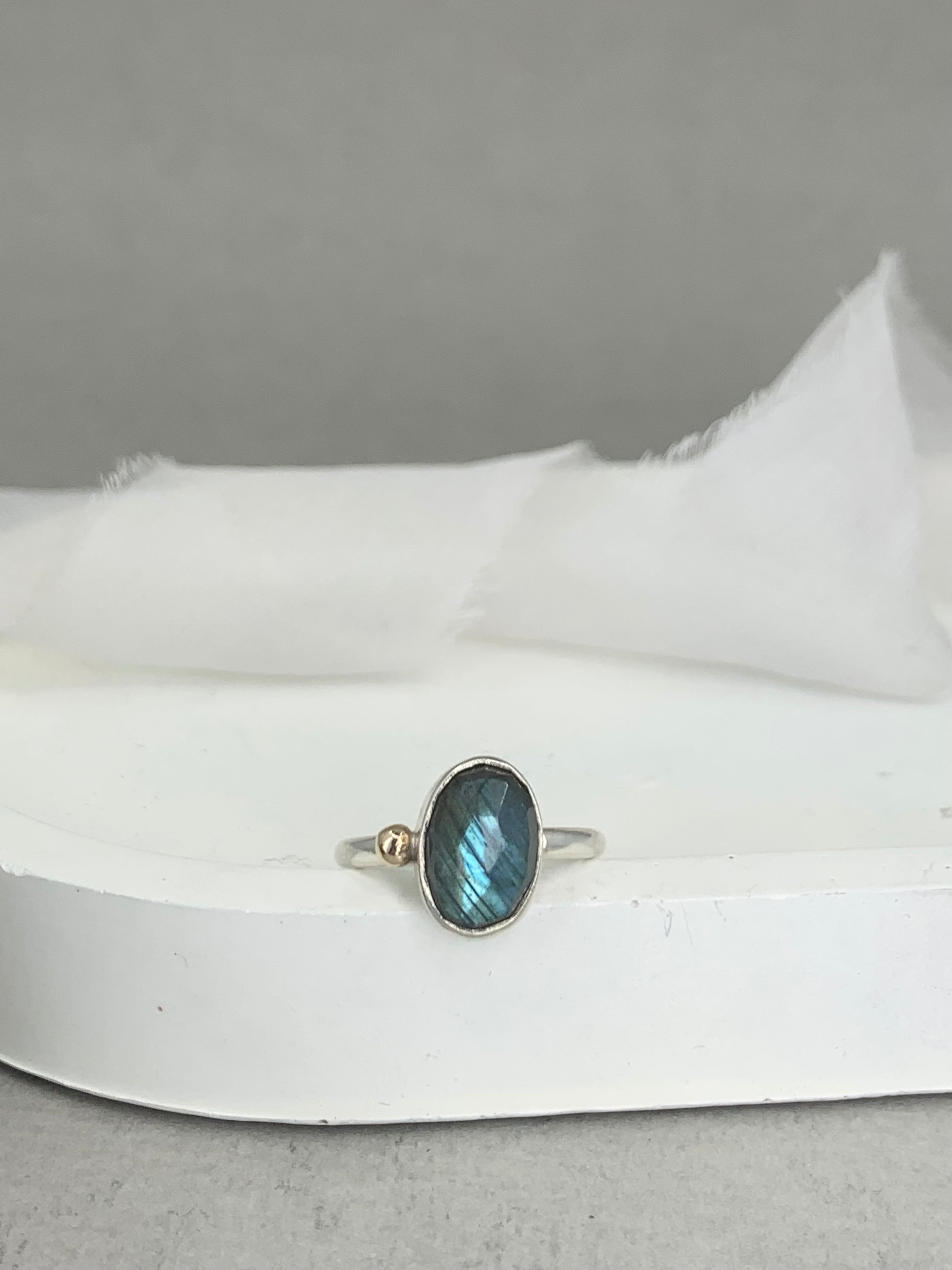 Sterling silver ring with an offset Laboradite stone and 9ct gold detail