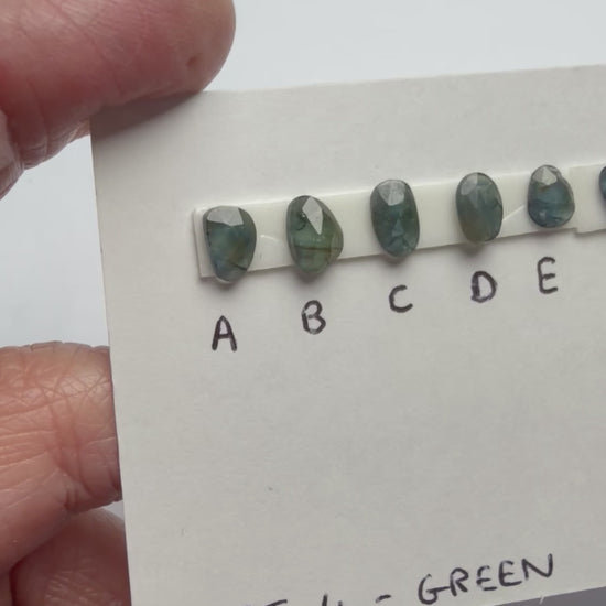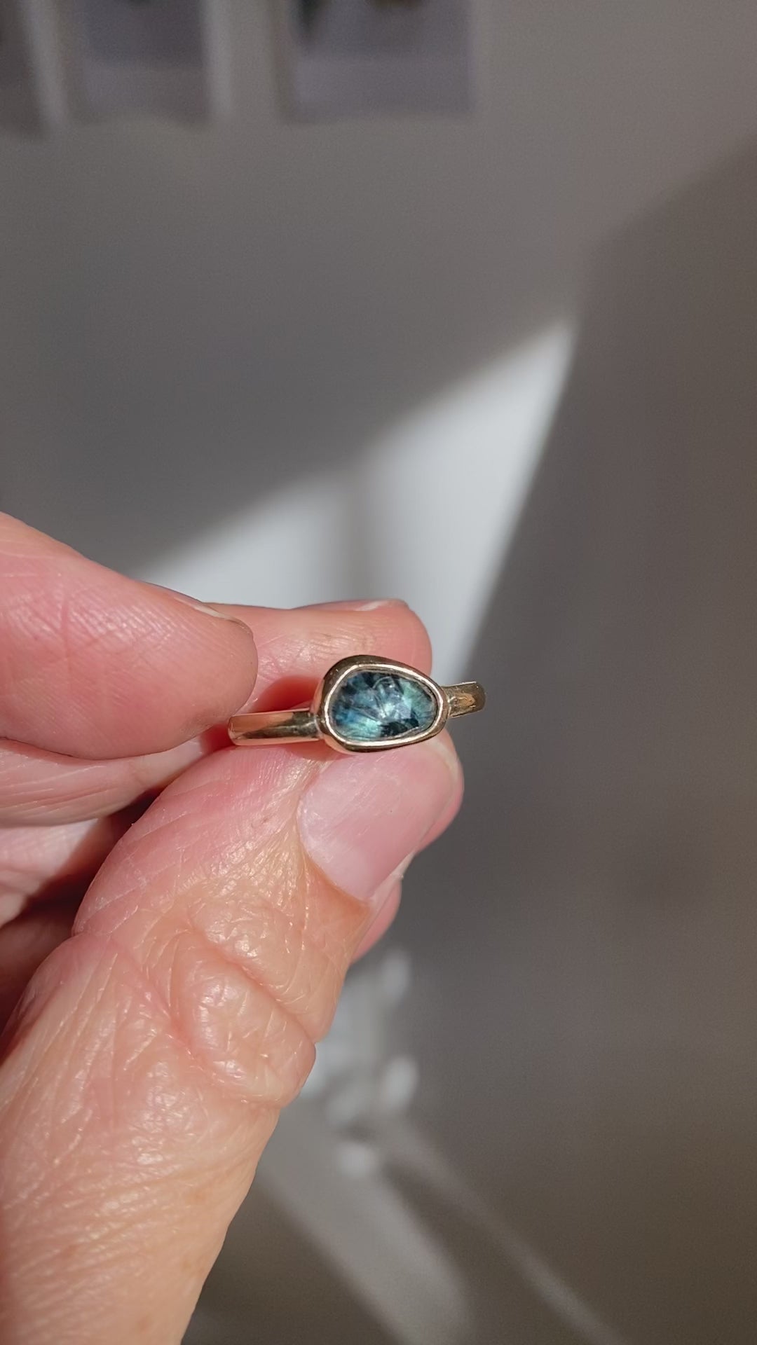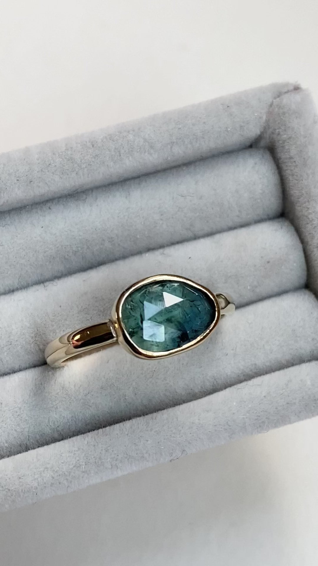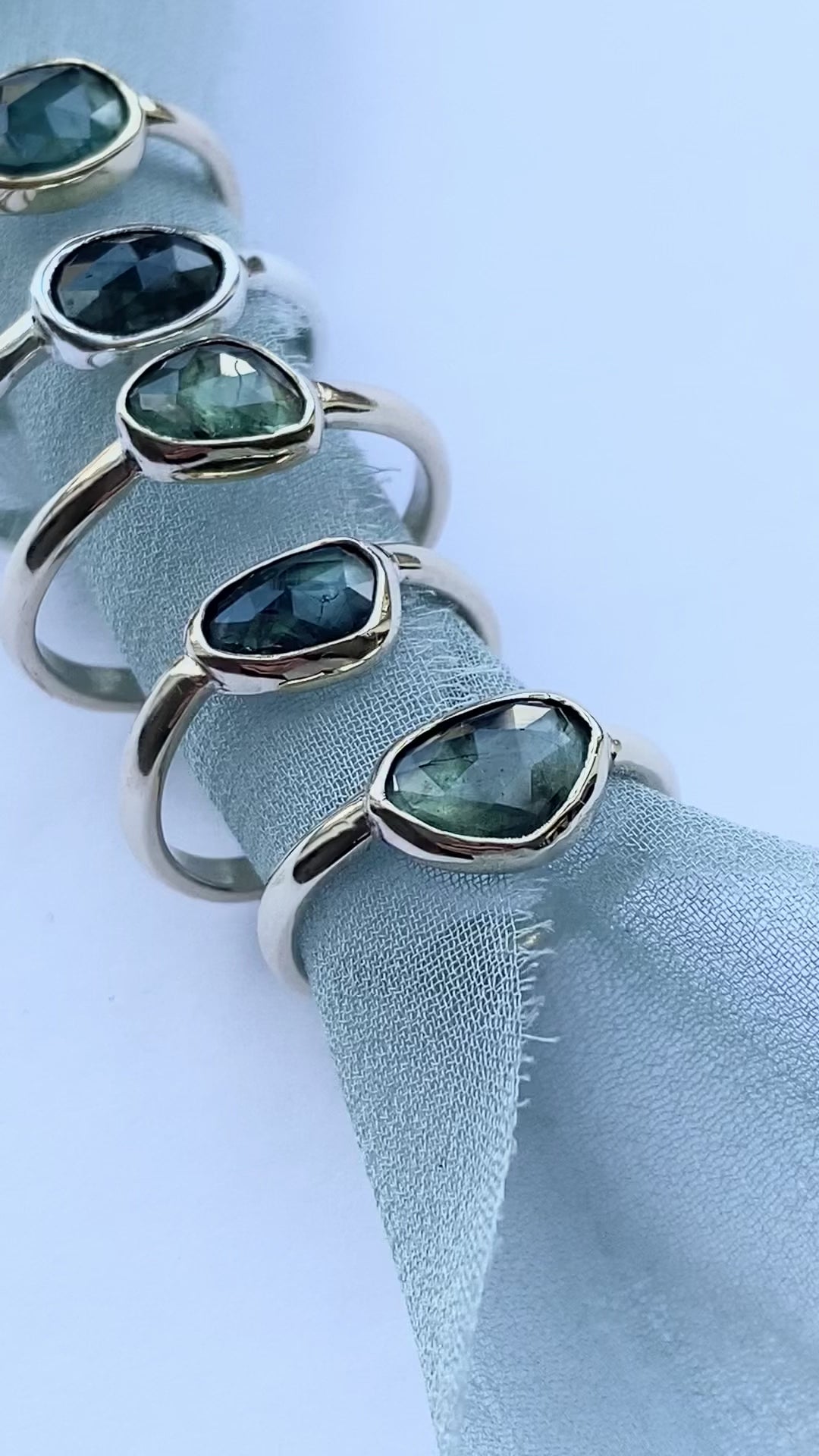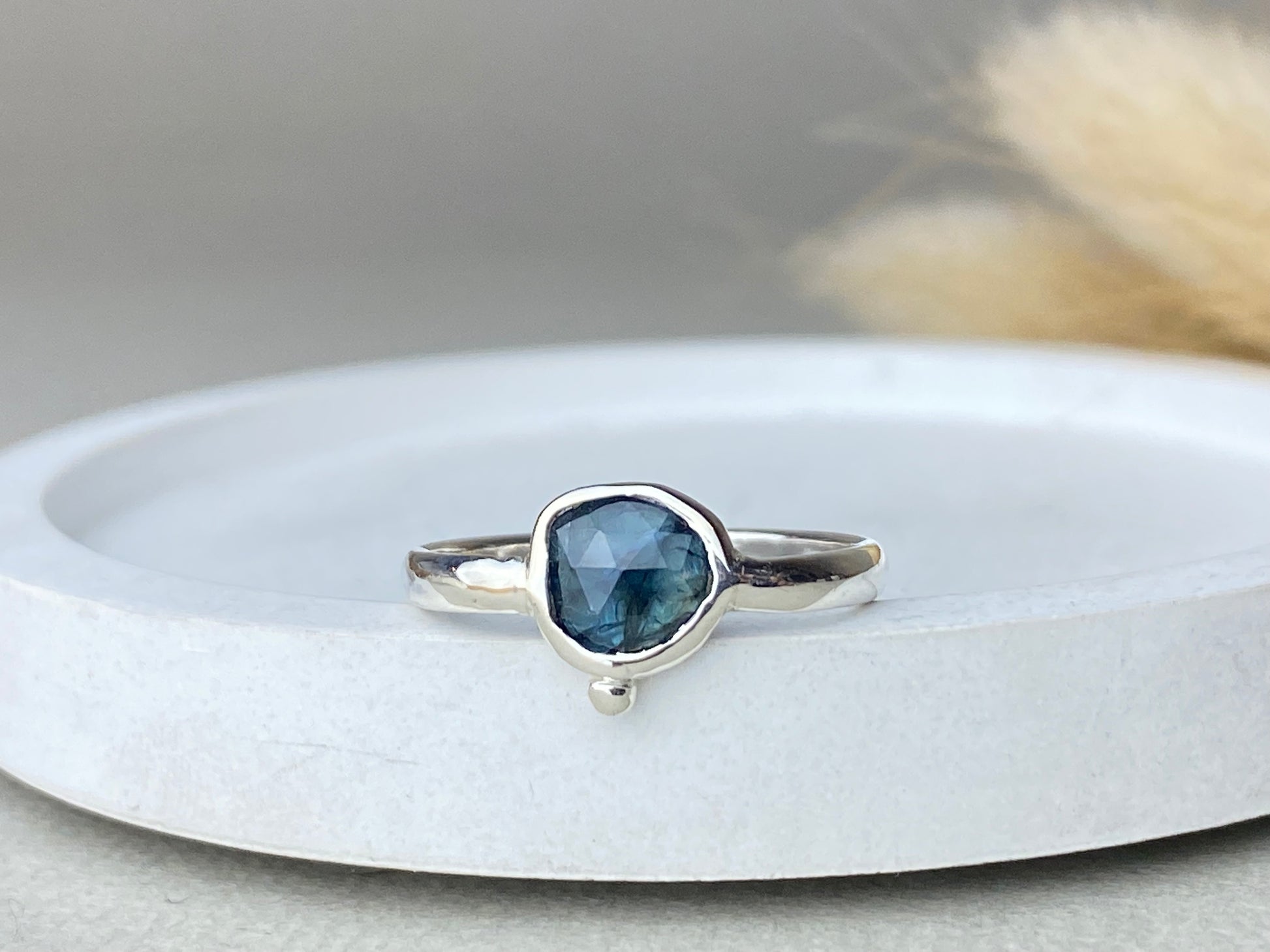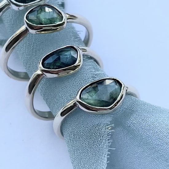 These beautiful individual rings are made to order with your choice of the shown organic shaped teal sapphires. They will be bezel set in either 9ct gold or sterling silver in your ring size. The gold rings will be hallmarked for your assurance of quality.
