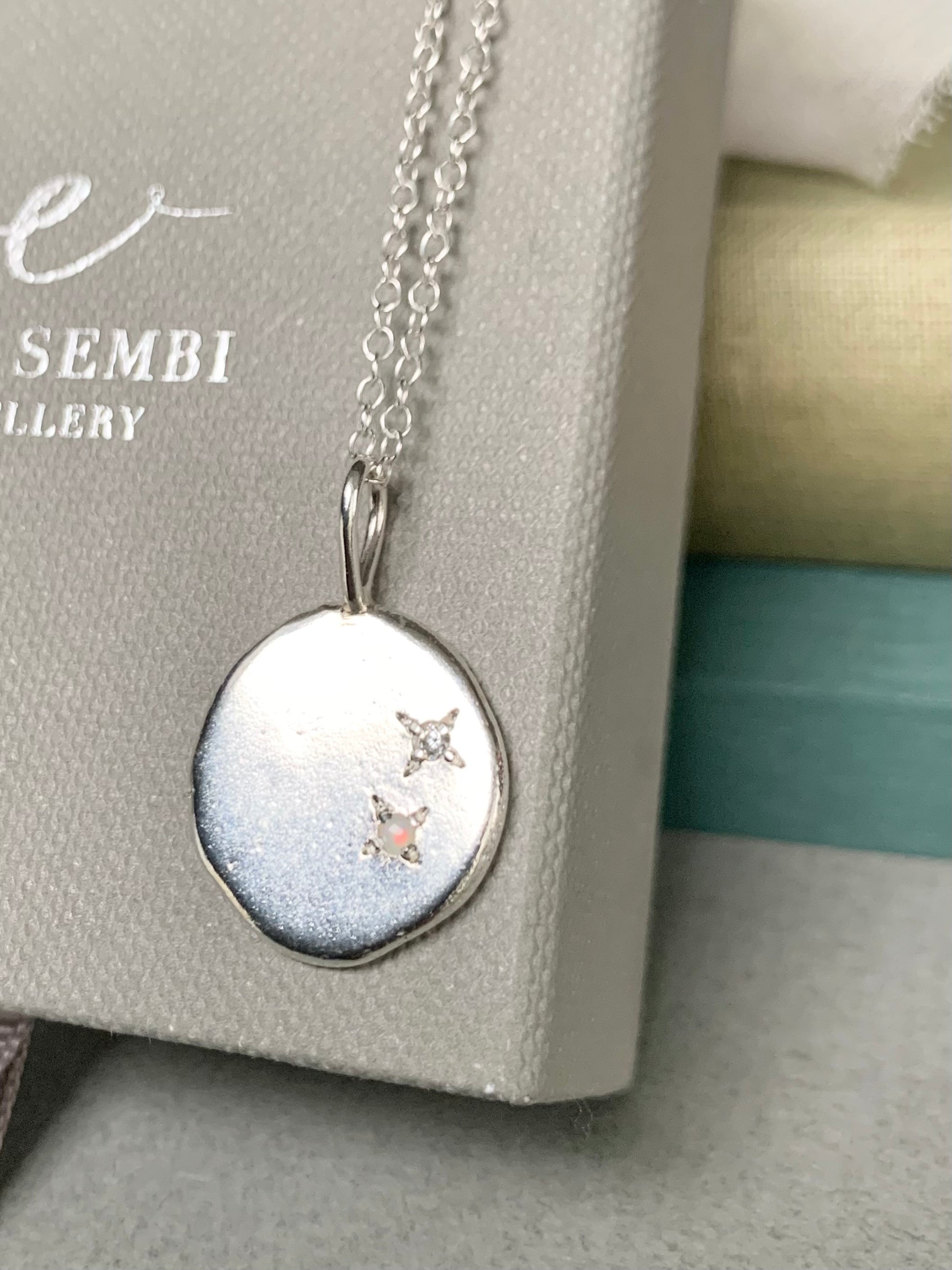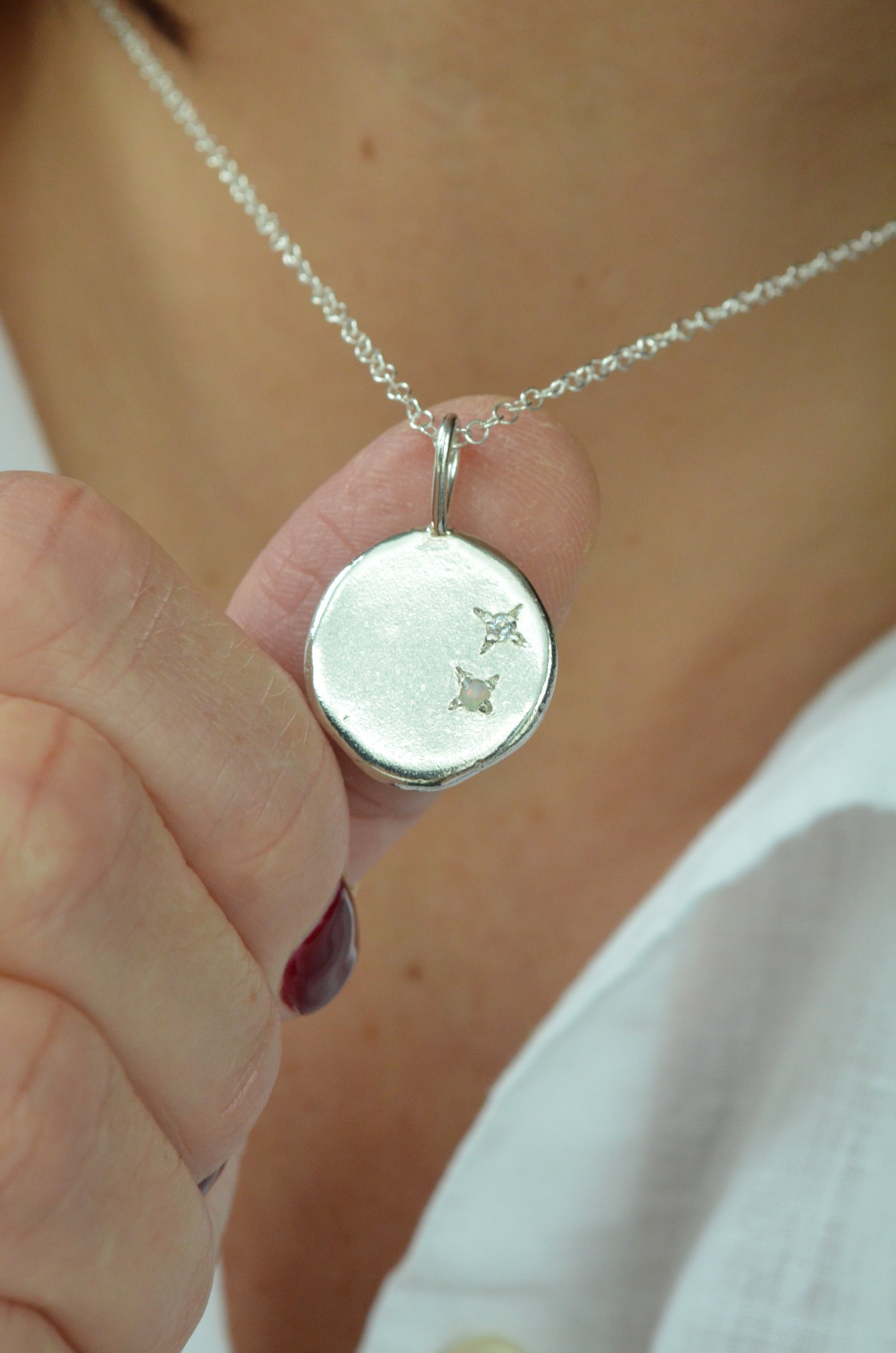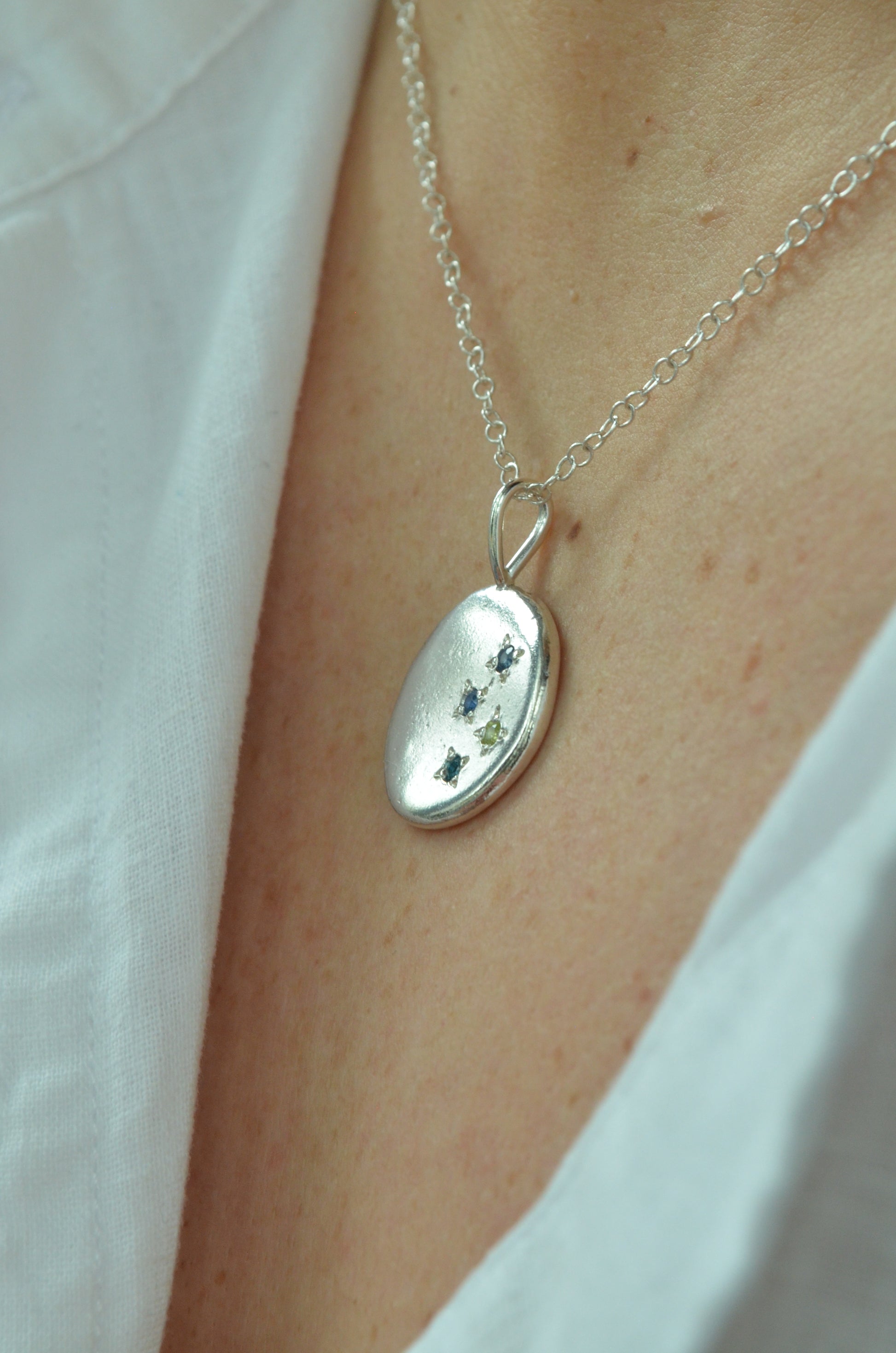 Each piece is made from recycled silver which is melted and the rolled to form a unique, organic shape before being soldered to a bail and your stones set using a star setting.