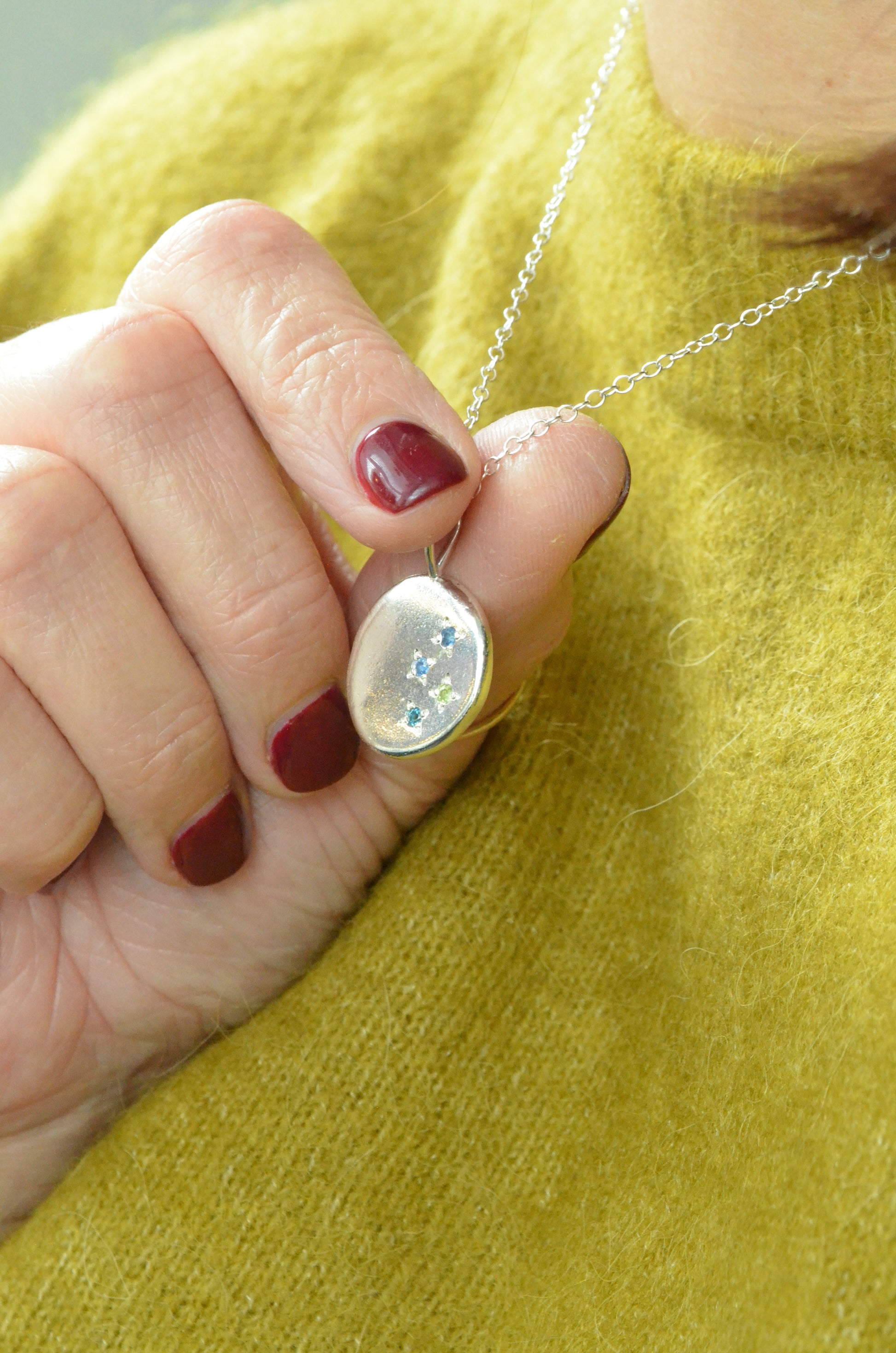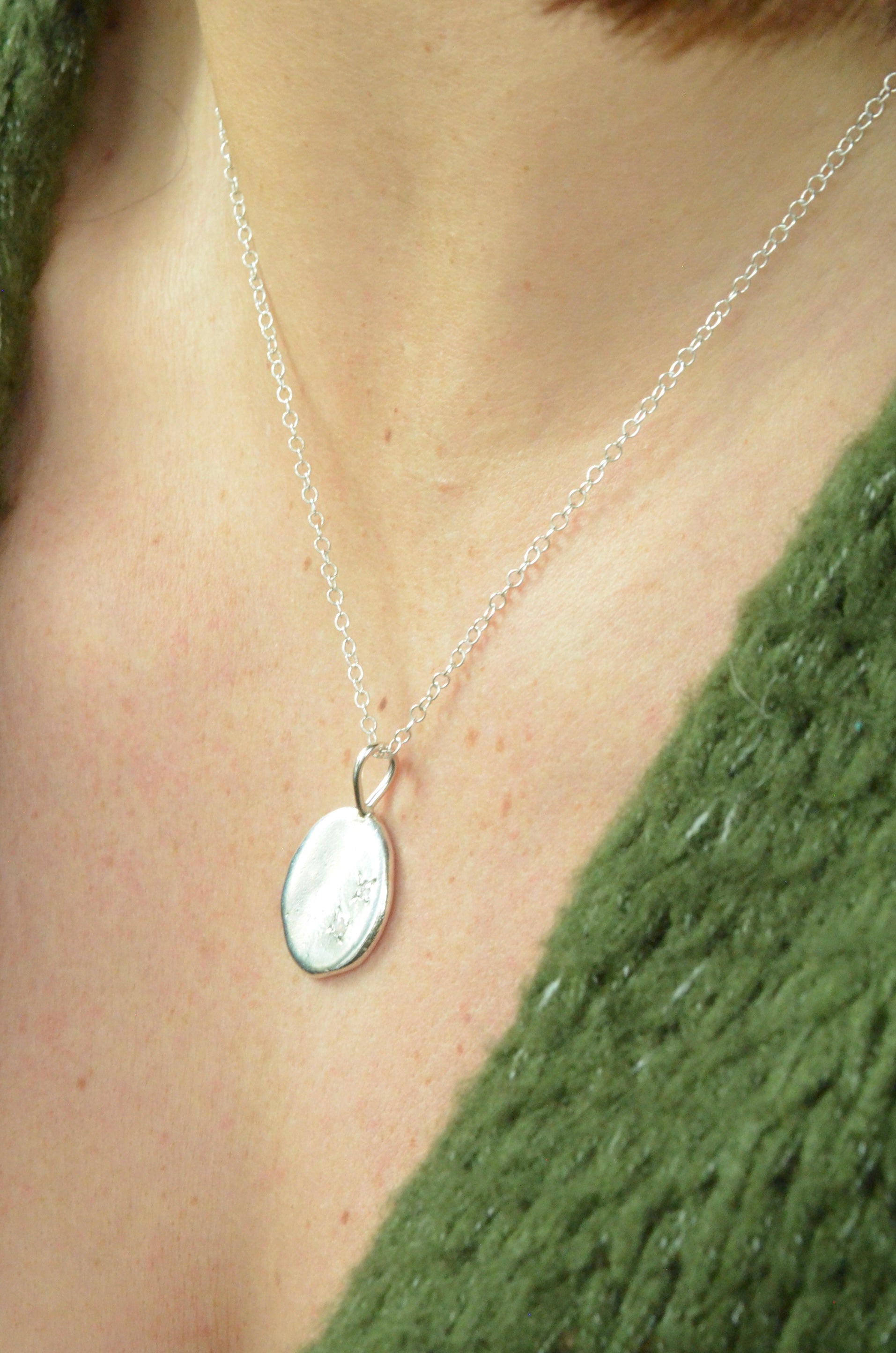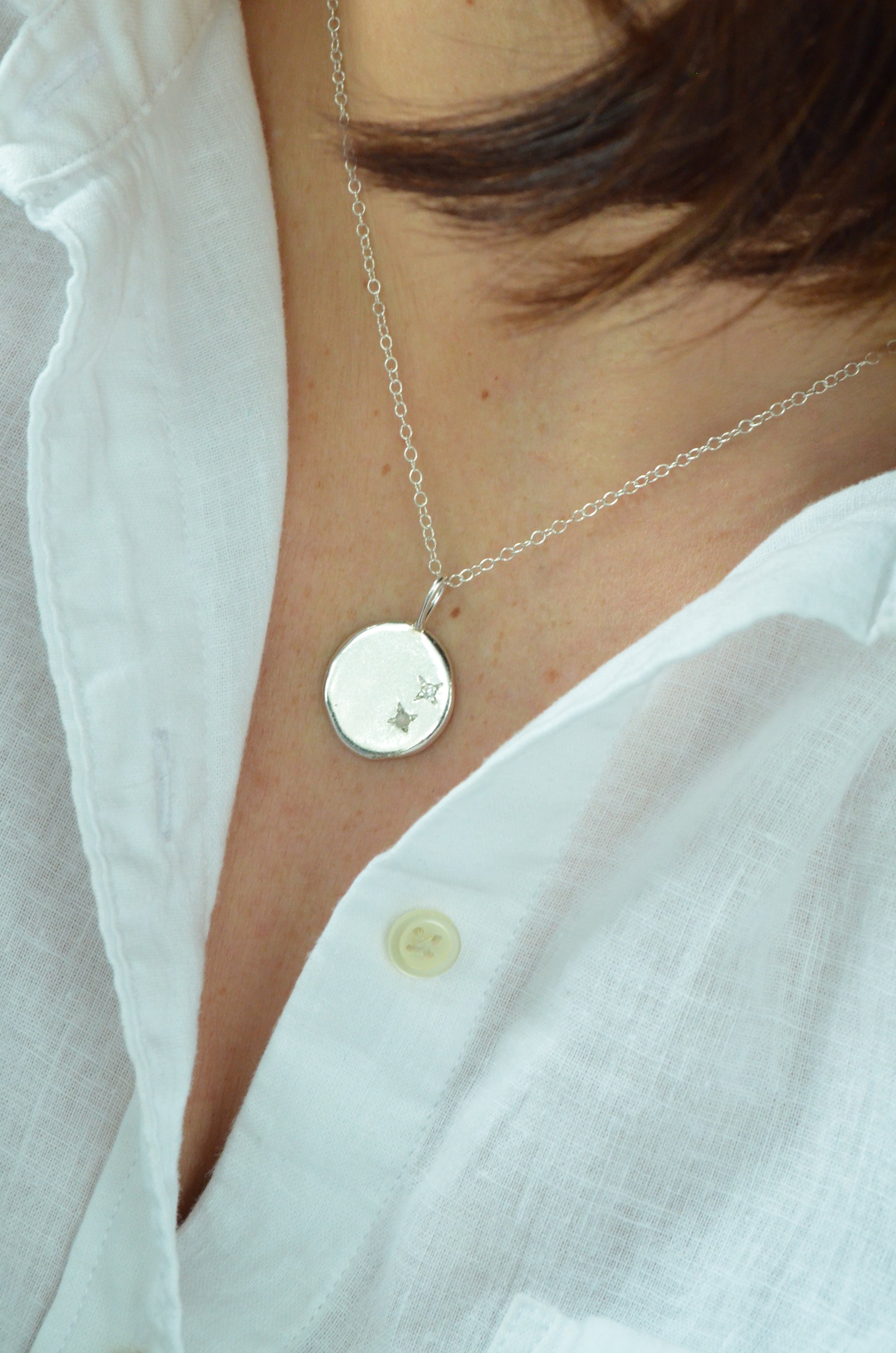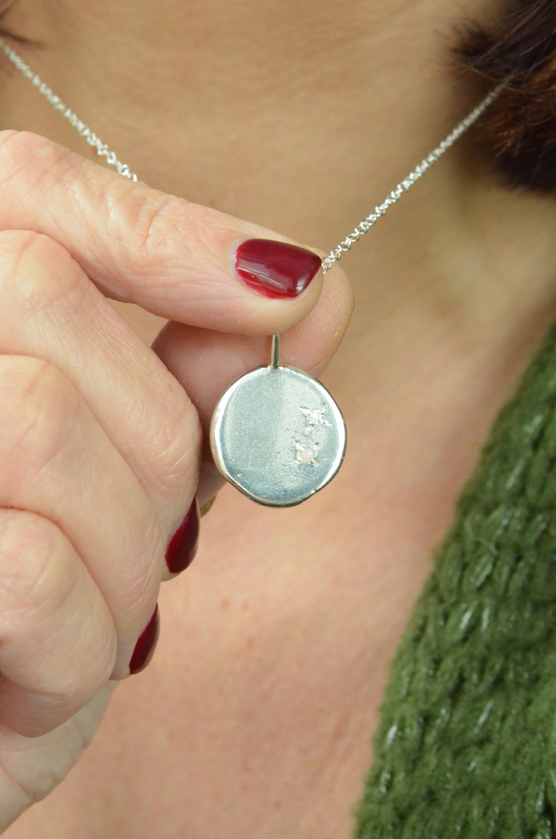 Each piece is made from recycled silver which is melted and the rolled to form a unique, organic shape before being soldered to a bail and your stones set using a star setting.