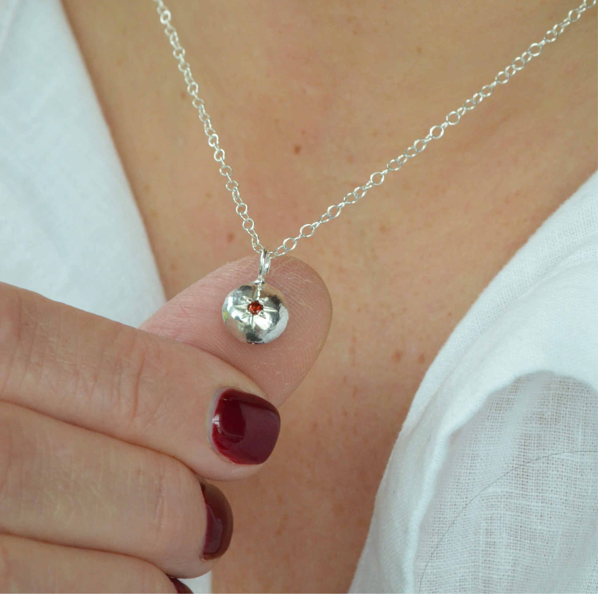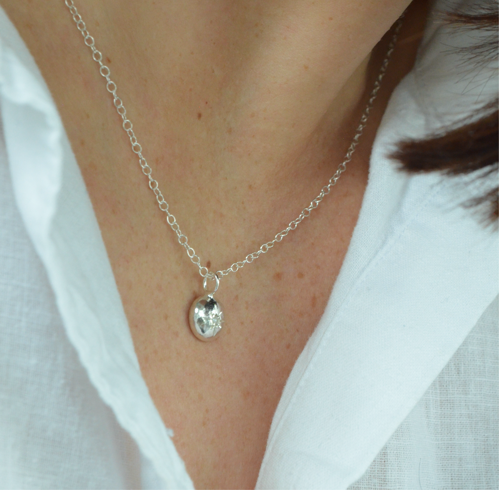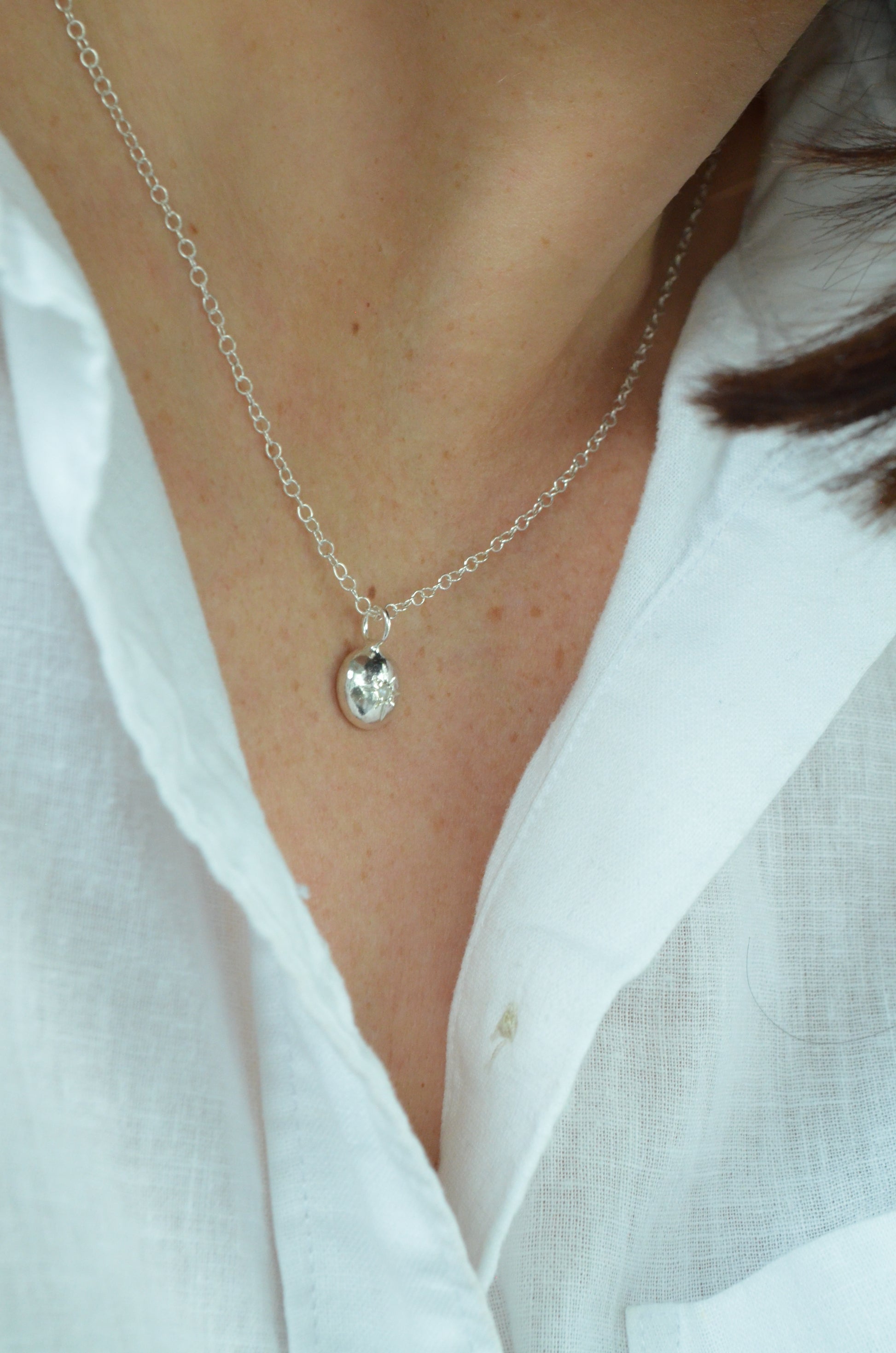Each piece is made from recycled silver which is melted into a tactile little pebble shape before being soldered to a bail and your stone set using a star setting.